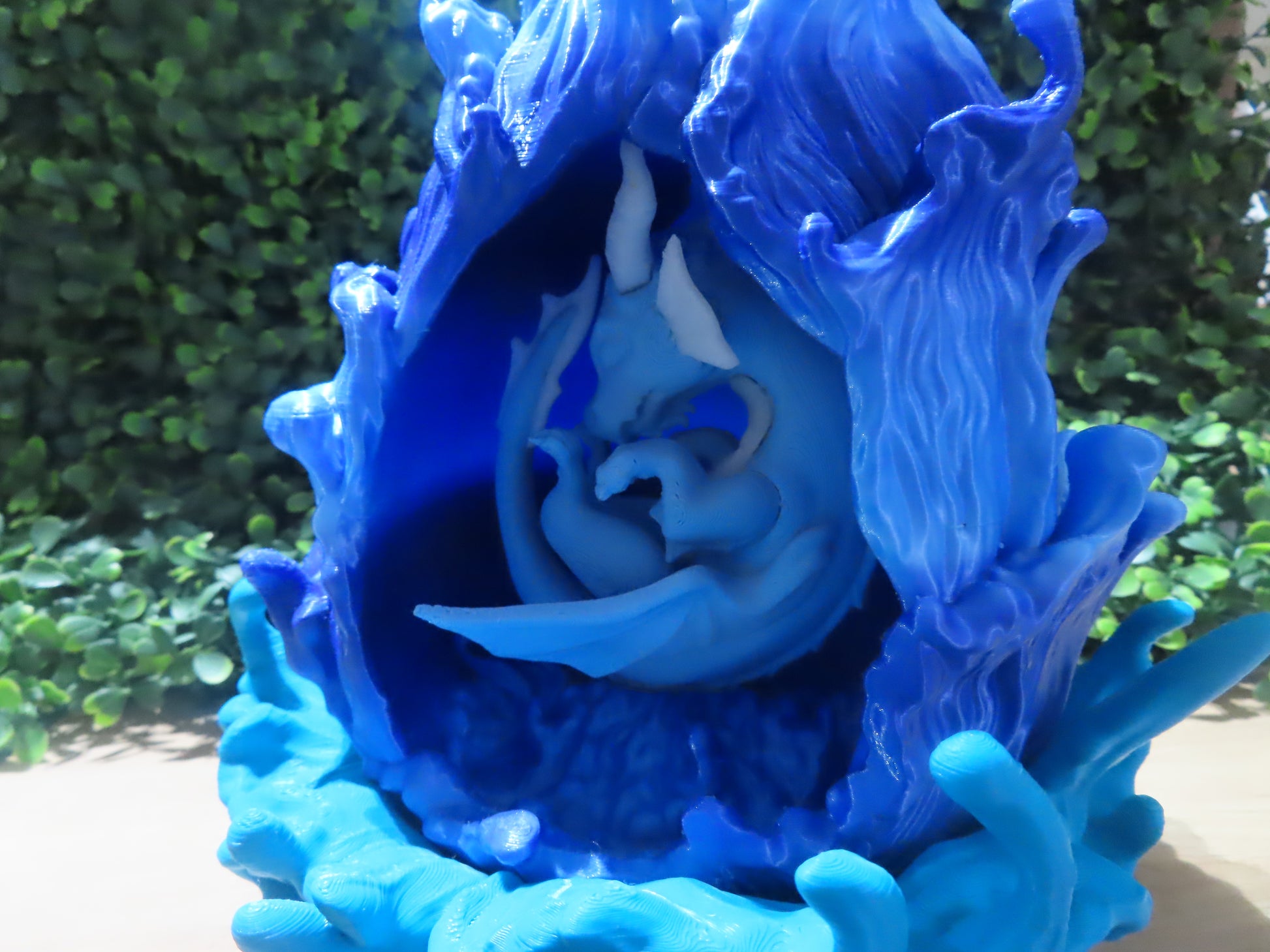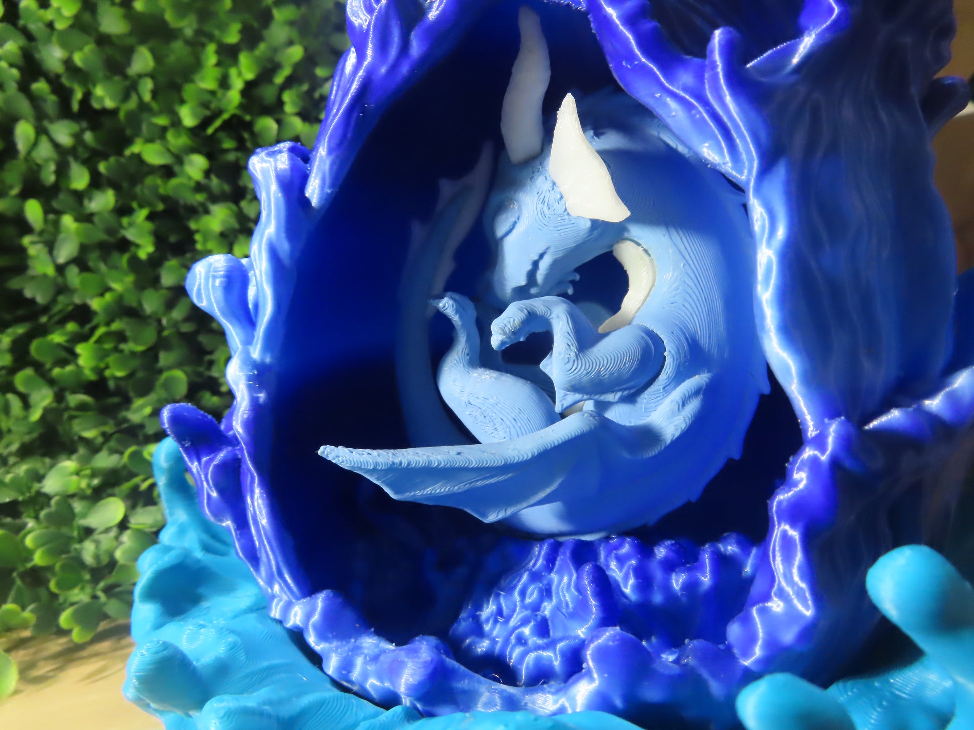 À l’intérieur de l’œuf, le dragon repose en gestation, symbole de force contenue, de vigilance et de protection silencieuse. La lumière chaude diffusée par la LED évoque le feu sacré du dragon, apaisant l’esprit tout en sécurisant l’espace subtil.