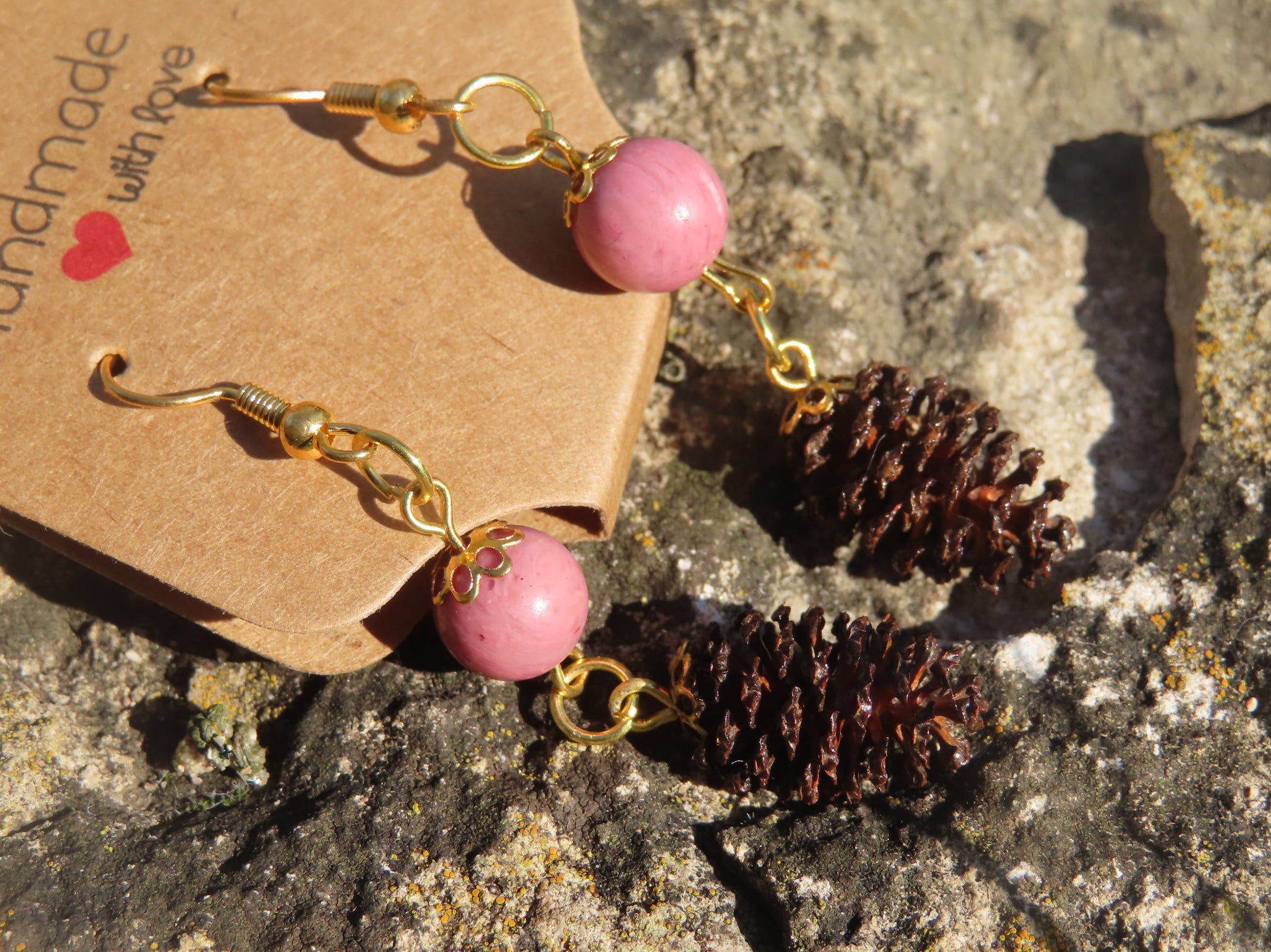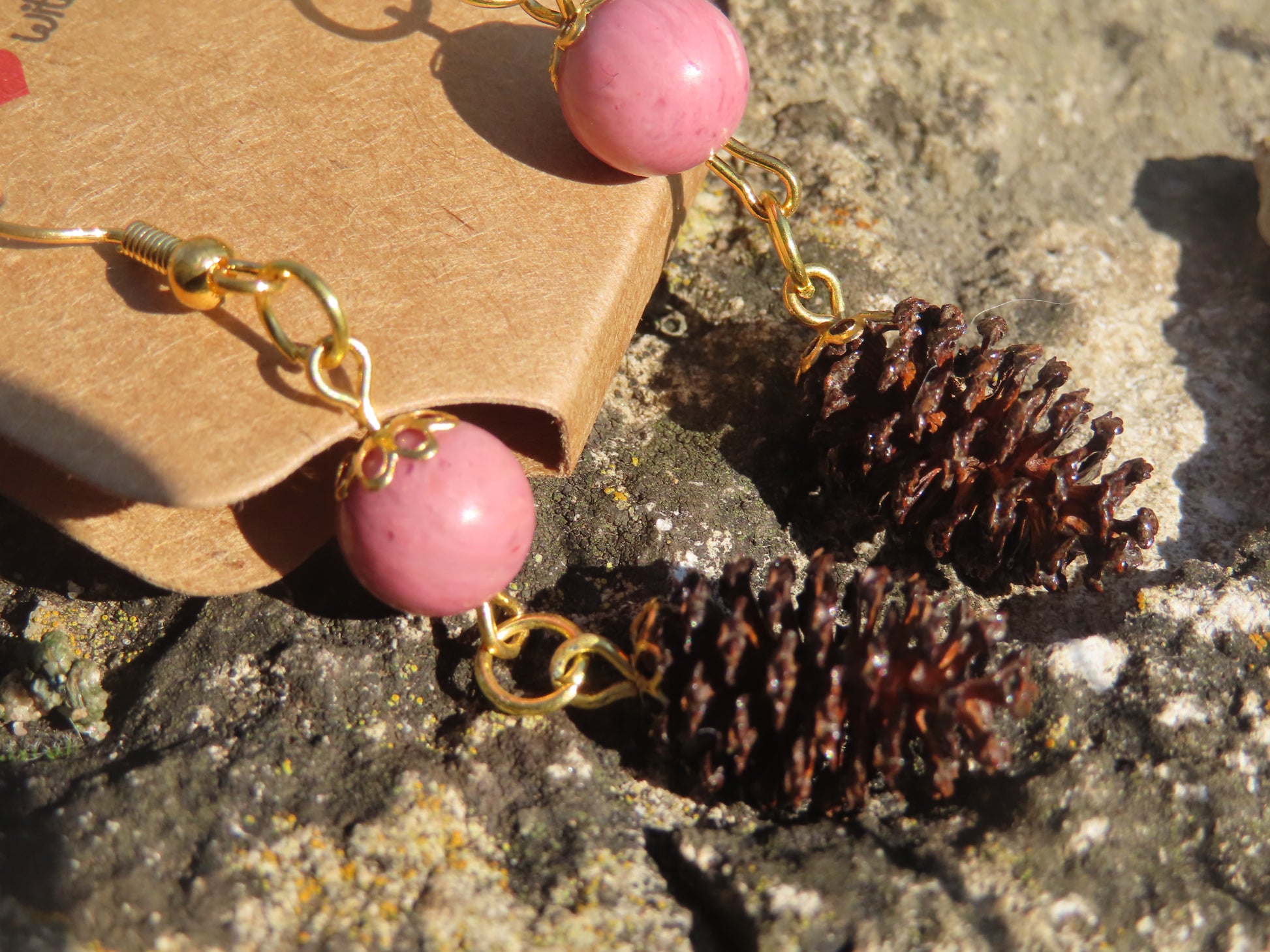 Matière : Aulne, pierres naturelles de rhodonite et acier inoxydable couleur or