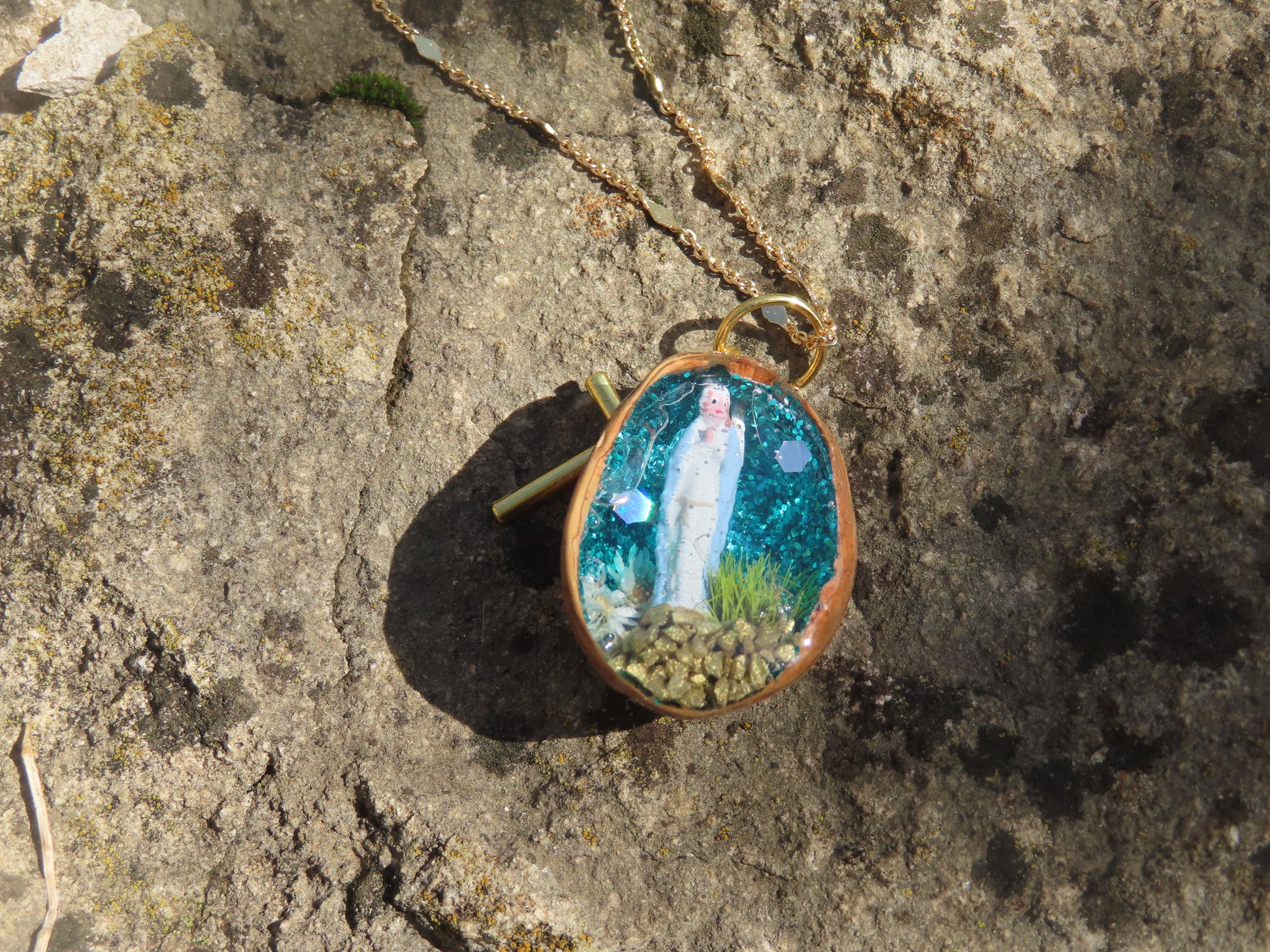 - Matières : coquille de noix creusée, résine époxy, chaîne en acier inoxydable doré 50cm